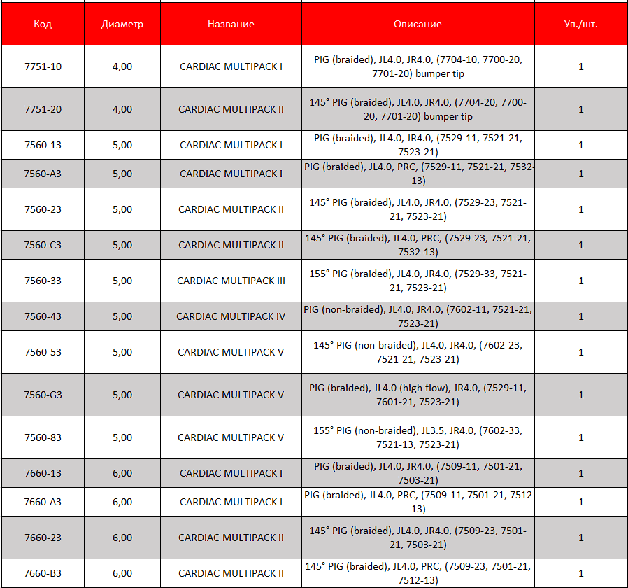 Набор диагностических катетеров для коронарографии Cardiac Multipack включает: