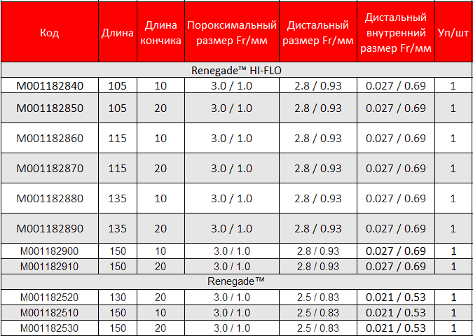 - Renegade совместим с катетером 0.038'' (0.97 мм) с минимальным внутренним диаметром 0.042'' (1.1 мм).