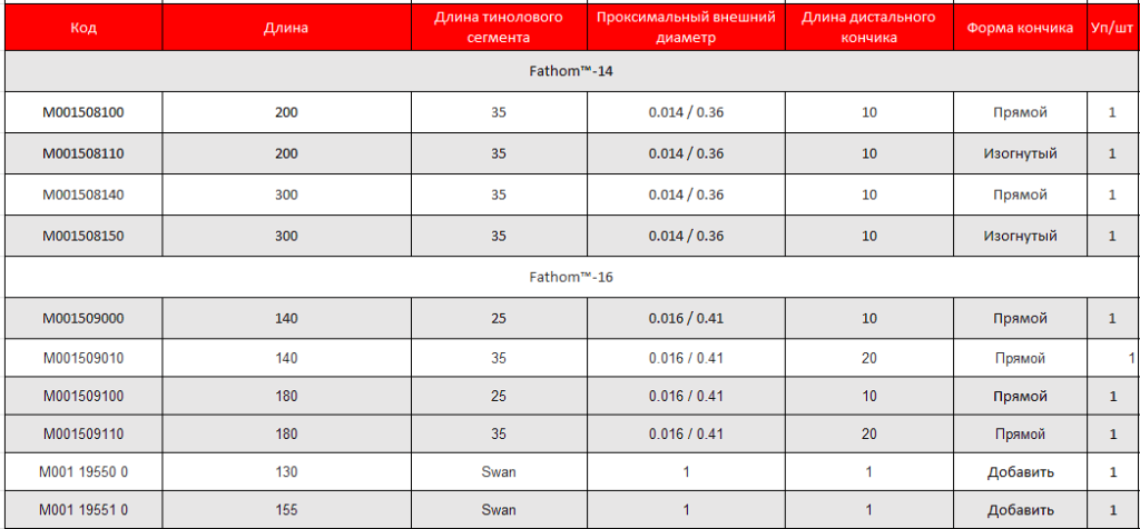 Микропроводники Fathom разработаны для процедуры эмболизации в периферических интервенциях. Используются в различных клинических ситуациях и представлены в особых конфигурациях специально для сложных вмешательств. Доступные на платформах 0,014" (0,38мм) и 0,016" (0,41мм) микропроводники имеют: нитиноловую гипотрубку с микронасечками и гидрофильным покрытием в дистальном сегменте; революционный дизайн, который позволяет получить доступ к самым сложным и извилистым участкам сосудистой сети.