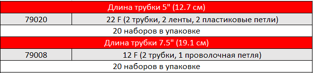 В наборы входят трубки красного цвета различной длины с пробкой на одном конце. Пробка фиксирует шовную нить в трубке с одного конца, и зажим при этом не требуется.