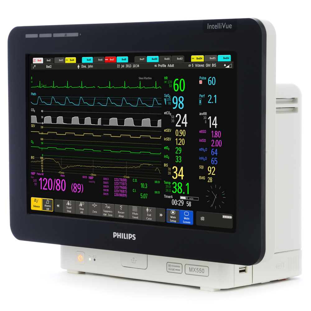 IntelliVue MX550 сочетает в себе высокотехнологичные функции прикроватного мониторинга и возможность резервного питания от батареи. Аппарат оперативно предоставляет необходимую информацию, что позволяет расставить приоритеты при оказании помощи нескольким пациентам одновременно.