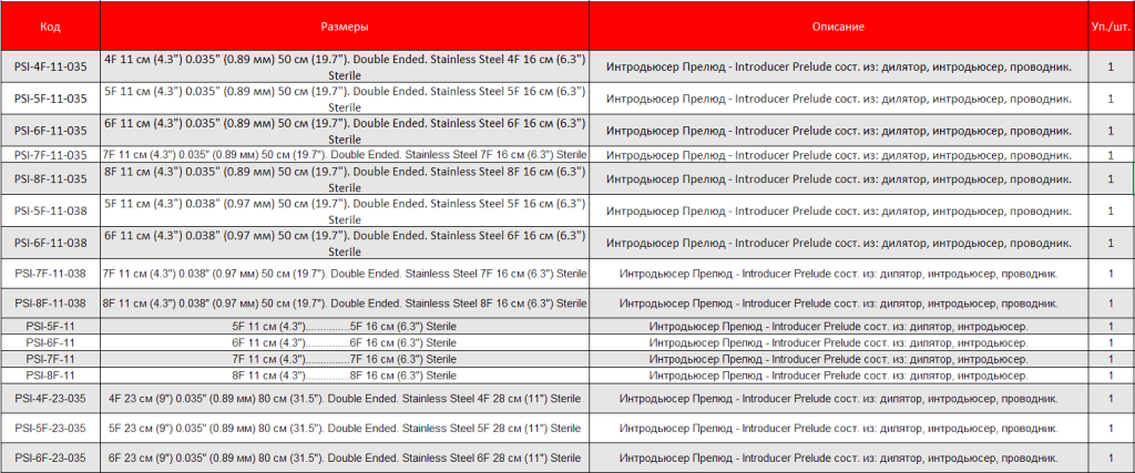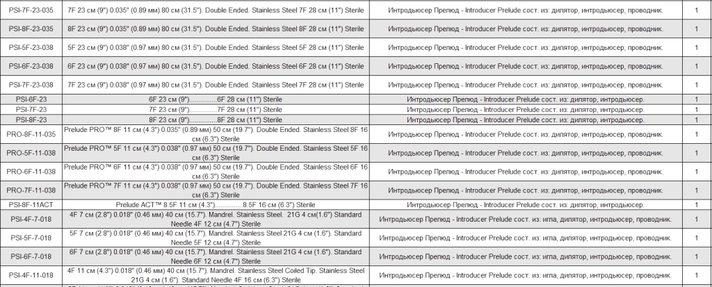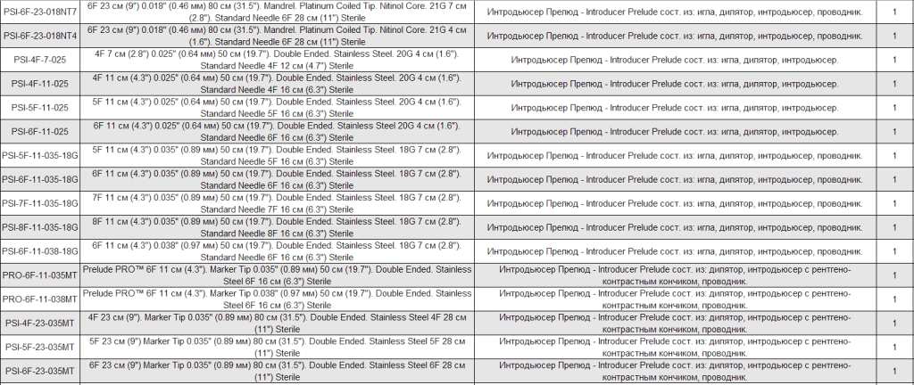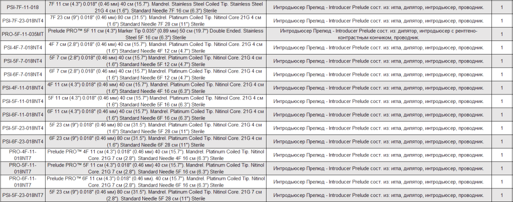 Интродьюсер PRELUDE упакован в футляр, обеспечивающий сохранность всех компонентов, особенно проводника. Компоненты могут быть промыты, находясь в футляре. Проводники с двумя рабочими кончиками, нержавеющая сталь, с 3-миллиметровым J-кончиком и гибким прямым кончиком. В набор входят сосудистый дилататор, интродьюсер и проводник (также доступен набор без проводника).