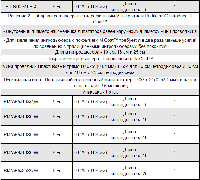 - Набор интродьюсеров с гидрофильным «M» покрытием облегчает процесс введения и извлечения при проведении стандартных процедур трансрадиального доступа