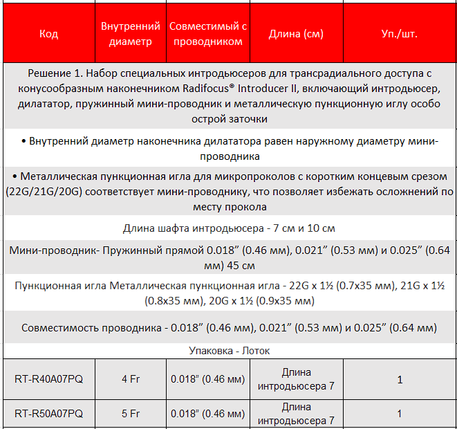 Будучи новатором и лидером в области сосудистого доступа, компания Terumo стремится предложить полный набор решений для процедуры трансрадиального вмешательства, устройства этой серии позволяют минимизировать воздействие на пациента и оптимизировать процедуру лучевого доступа.