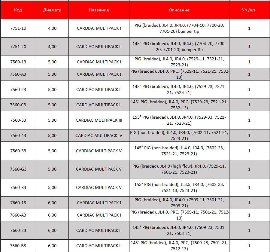 - Катетеры Performa Пигтайл (Straight Pigtail 145, 155, MOD AMP Right, MIV RADIAL ST, Ultimate 1, Ultimate 2, Ultimate 4, Ultimate 4-T40, Ultimate 4-T45). Диаметр 4F, 5F, 6F, длиной 100 или 110 см.